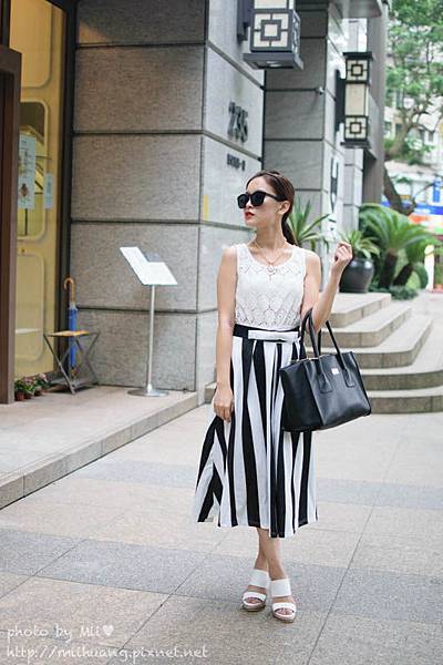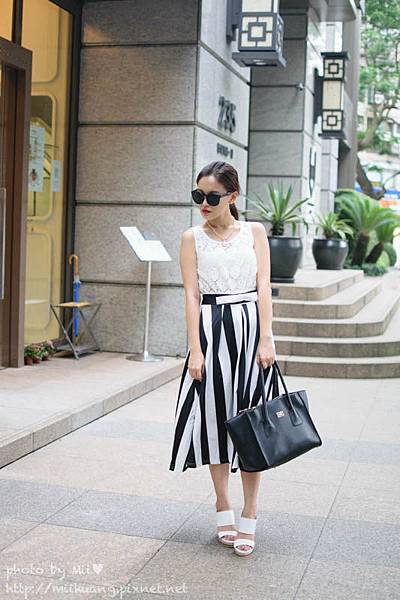 但是因為這件條紋及膝裙的款式很基本,整體有種最近很紅的"全身白"搭配的錯覺